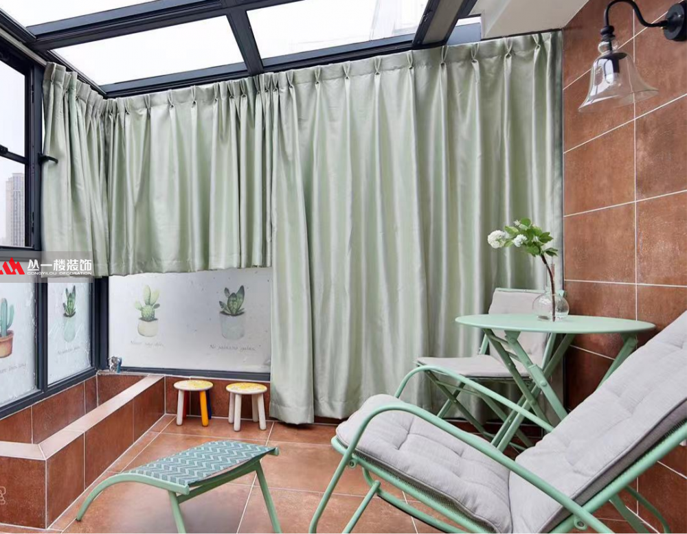 将原来放洗衣机的地方,改造成了露天的玻璃房,玻璃房分为两个空间,一个晒太阳喝下午茶的地方,成哥(男主人)可以在这里养养花,喂喂鱼。