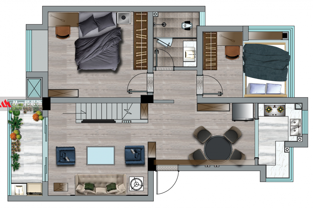 户型原始结构只有两个房间,空间很多都再浪费,让使用的空间变小,非常压抑,小小夫妇(屋主)希望在原本的户型结构上,增加开阔度,但同时考虑到要生二胎,能够多一点房间。设计师将房间楼梯调整方向,打造出一个书房,不到90㎡的房子,瞬间有了120㎡的赶脚。