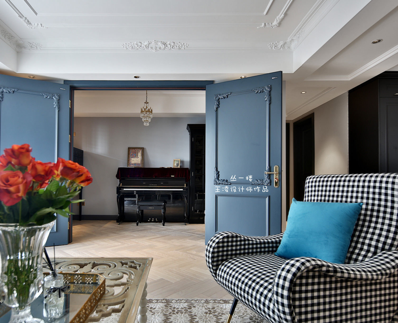 墙顶面挑选的是极具代表性的复杂花纹的法式石膏线,强化了法式风格的定位。墙面选用的则是大面积的灰色和灰蓝色纯色墙面漆,局部神秘的黑色和金属的点缀,不经意的细节诉说着法式优雅,低调而奢华。