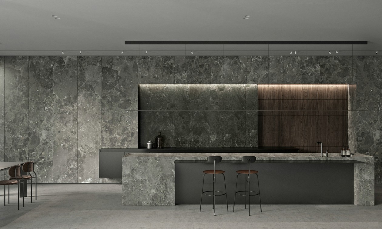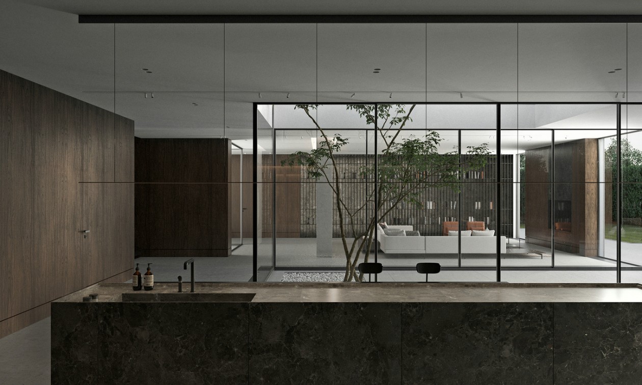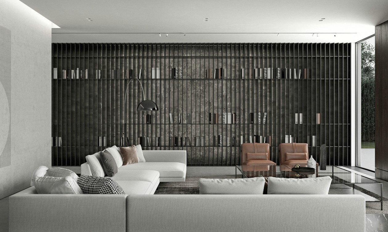设计说明:本案业主三代同堂,设计风格上期望满足不同家族成员需求。整体公共空间基调以成稳的配色为主,运用深色的木质隔栅搭配灰色系石材,营造低调的设计质感。